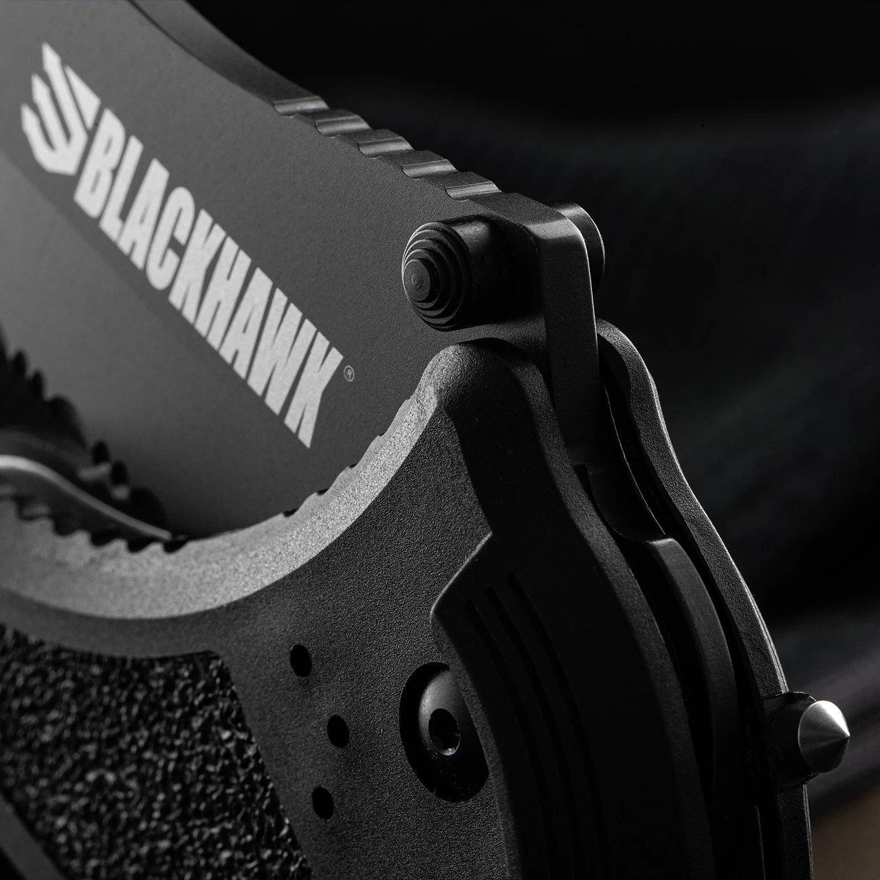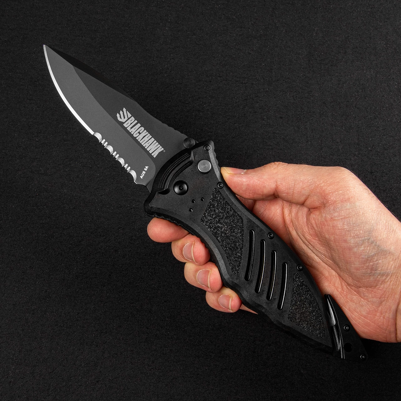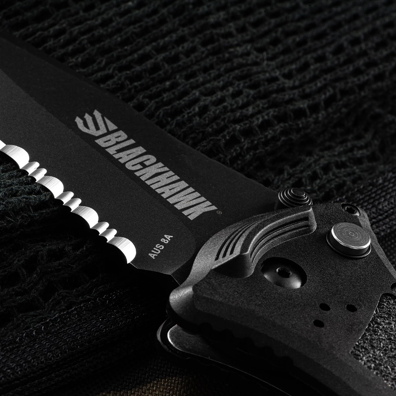 The Blackhawk CQD Button Lock is a hefty knife design with many outstanding properties that make it an excellent choice for tactical applications. It features a AUS8 Stainless Steel blade with a choice of either plain edge or with a part-serration. It locks into place with a linerlock operated by a button on the side of the handle.
