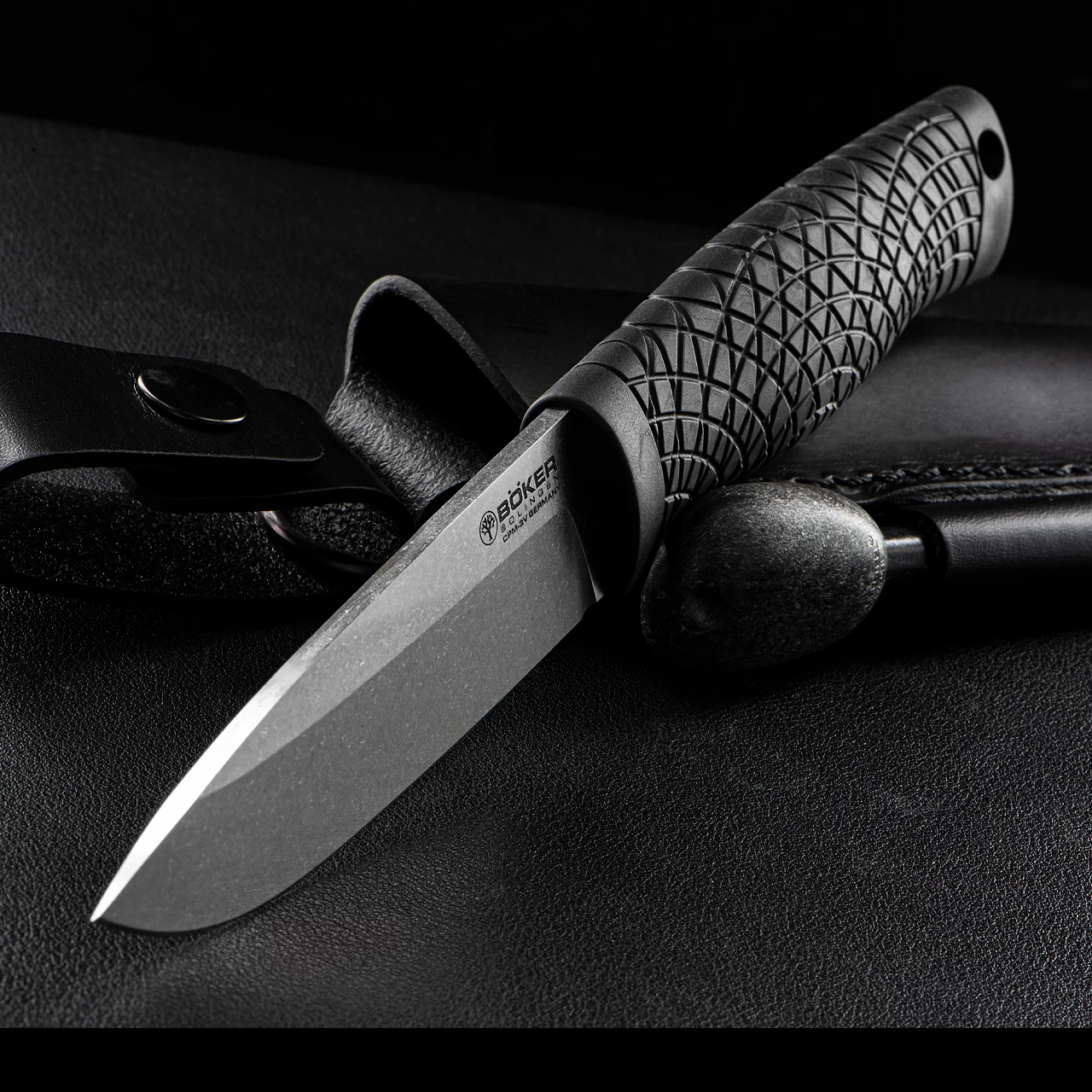 With the Boker Bronco these ambitious requirements were met in the following way: The CPM-3V was developed by Crucible Industries LLC – the specialist and worldwide market leader in powder metallurgical steels – to provide unprecedented shock-load tolerance, breakage elasticity and splinter resistance with a phenomenal edge retention and hardness of 62-63 HRC. These properties of the powder-metallurgical carbon steel were achieved, among other things, by a precisely adjusted chromium content of 7.5%. In this way, the positive properties of the alloying element Cr, such as the increase in wear resistance and hardenability, could be utilised while maintaining a fine microstructure. The universal wide drop-point blade with a high-set saber grind has always been the hunter’s preferred shape for both big and small game and is also suitable for both fine tasks such as stick feathering and for the more coarse, such as the obligatory batoning. The tang is continuous and protrudes a few millimetres from the end of the handle. This ensures maximum stability and the tang can also withstand powerful blows with a log or other object. A short part of the back of the blade forms sharp 90° edges on both sides for striking sparks from the included firestarter.