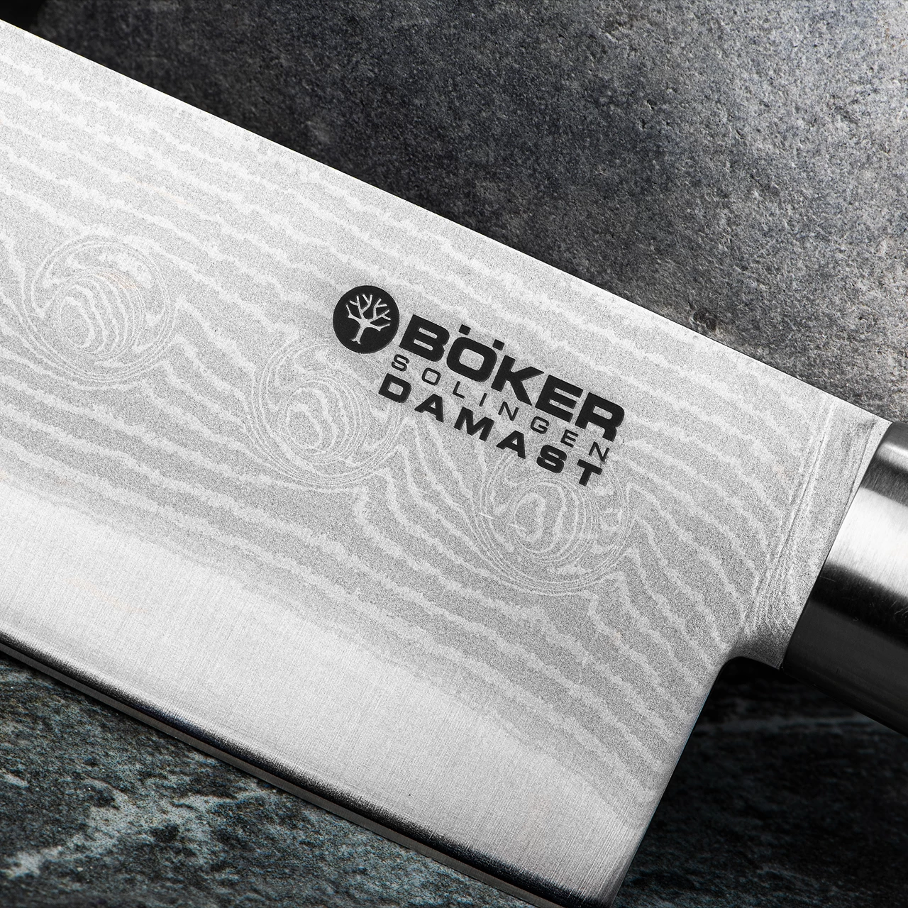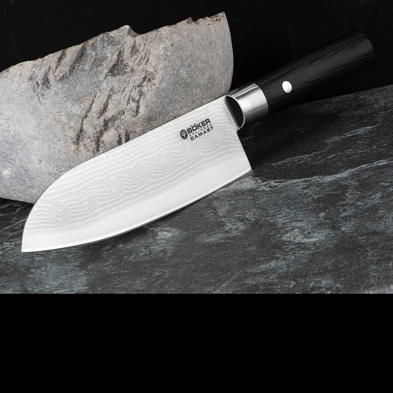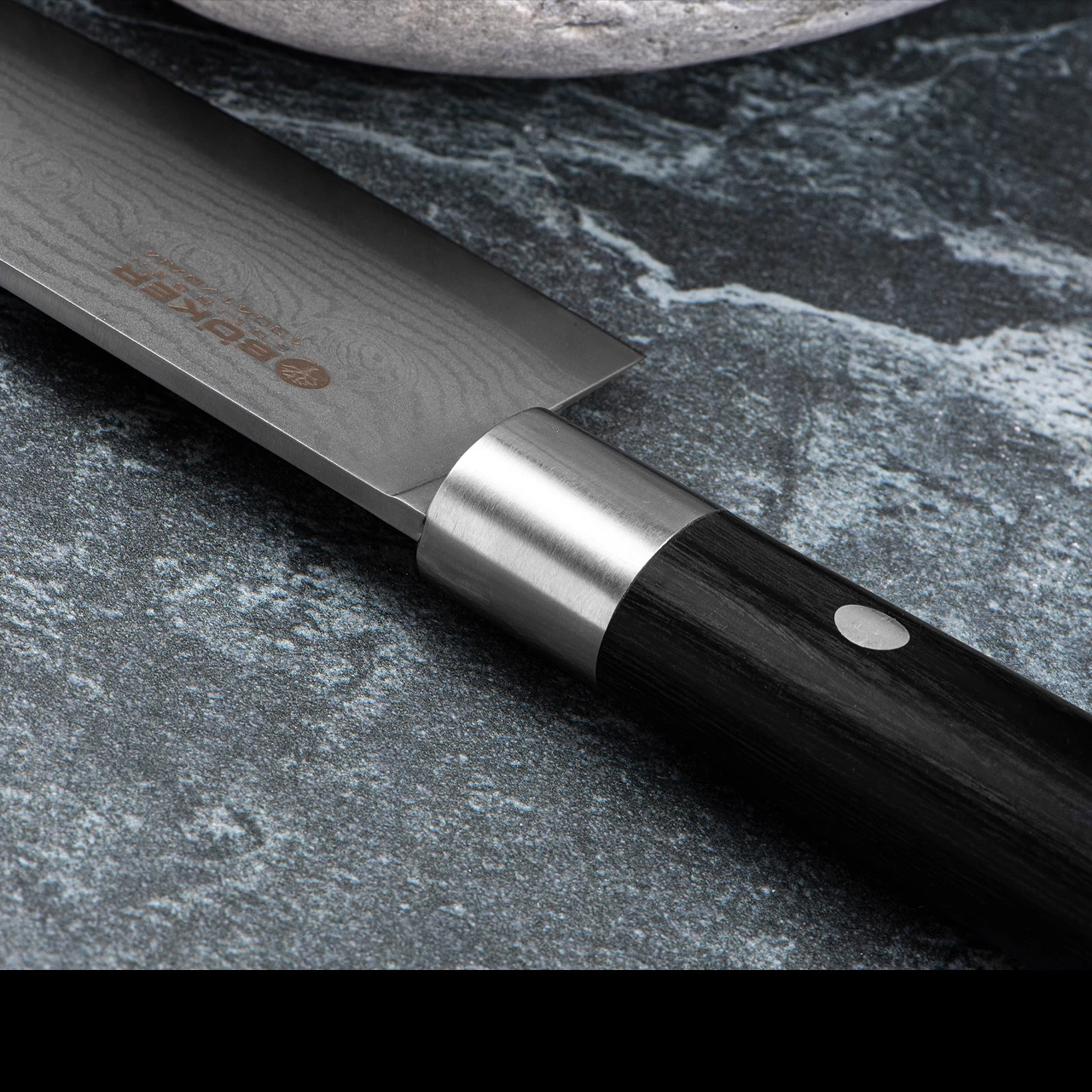The Boker Damascus Black Kitchen Knife line combines traditionally Japanese handles made of black local Plywood with razor-sharp blades made of stainless Damascus with 37 layers of steel, characterized by a beautiful grain. The extremely high-impact core of the Damascus blade consists of the high-performance VG-10 steel.
