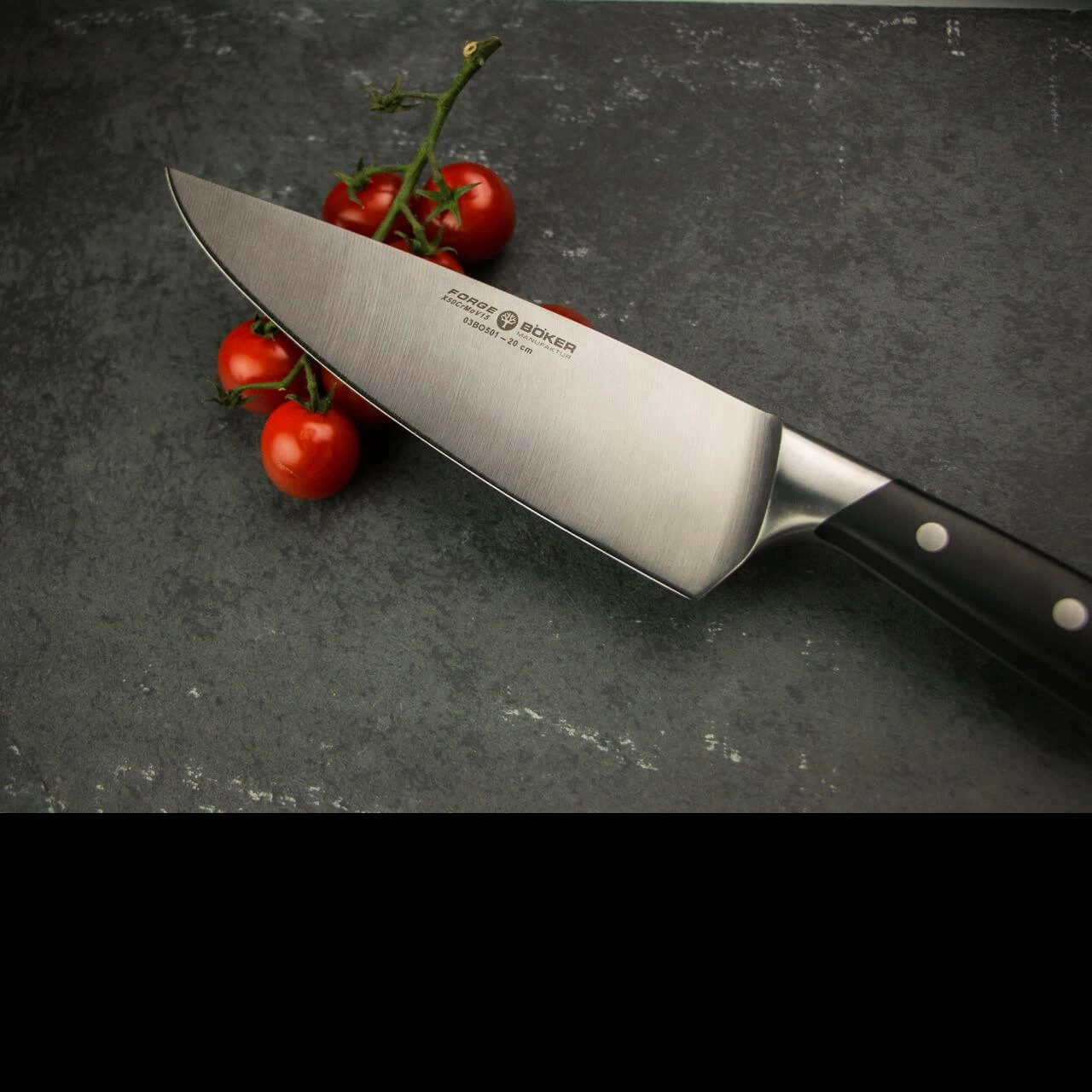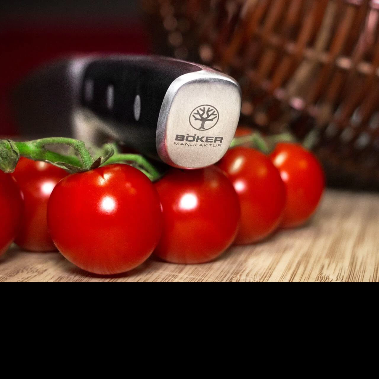 The Boker Forge Kitchen Knife line combines innovative and dynamic designs with a classic material selection, at a premium quality level. The attractive, eye-catching design lines distinguish this series from the masses of average kitchen knives, without being too flashy.