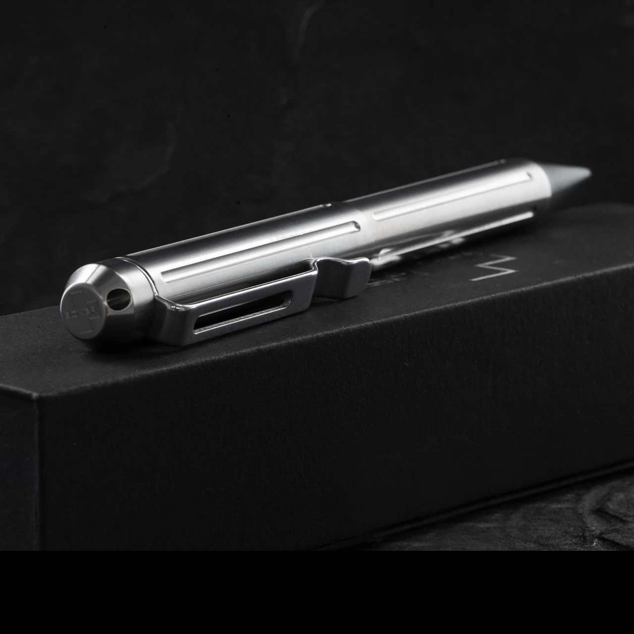 The innovative Boker Plus Tactical Fountain Pen combines the versatility of modern tactical pens with the traditional writing feeling of a classic fountain pen. The deeply knurled body offers a superior grip and a great appearance. It is made of high tensile aluminium and feels very comfortable in the hand. It is a hefty writing tool weighing in at 55g with a quality, precise manufacture.