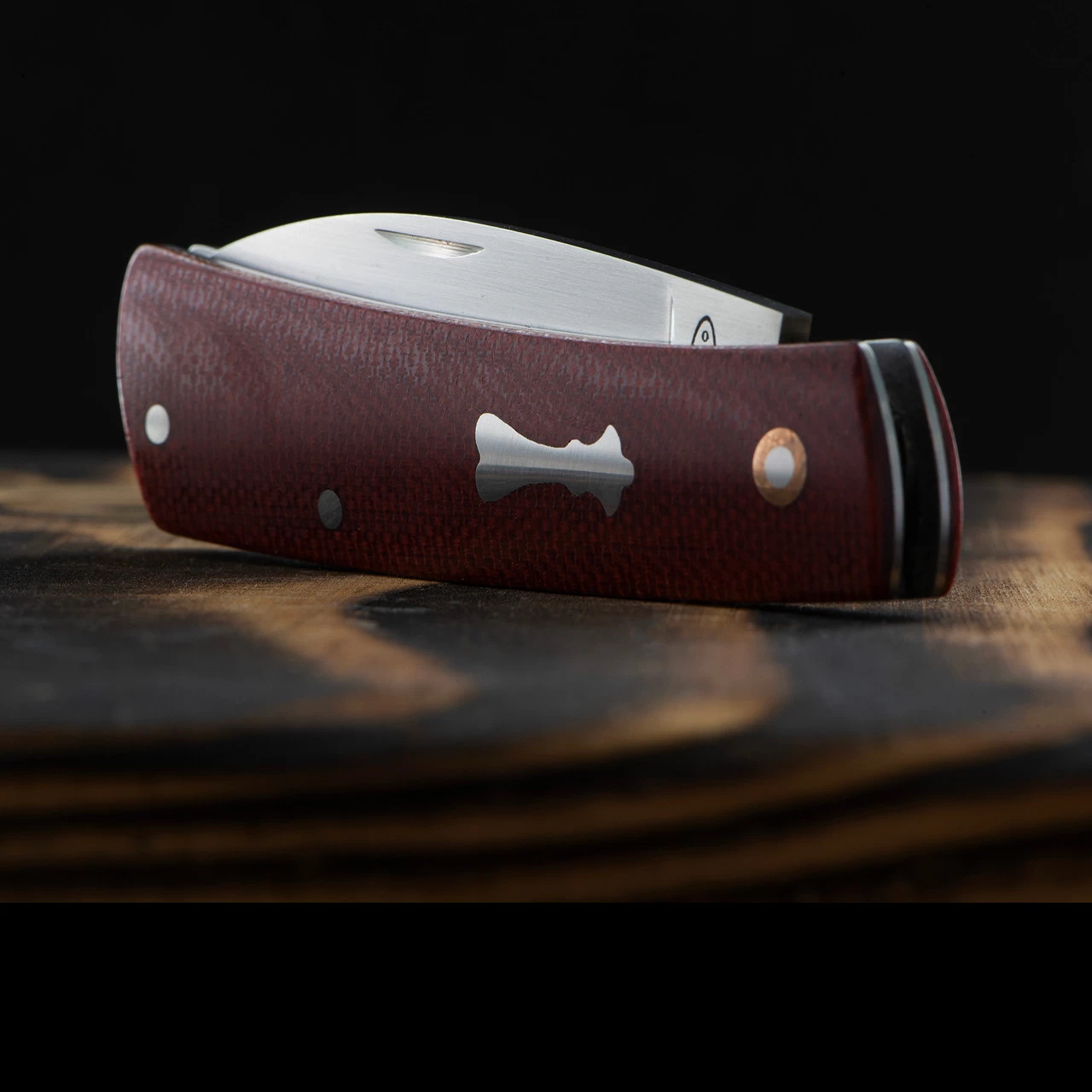 The handle is red micarta with a “chess piece” stainless inlay and a copper lined pivot.