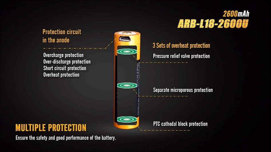 The Fenix ARB-L18-2600U 18650, 2600mAh lithium – ion battery is specifically designed for high intensity led illumination use and is the perfect companion for all current Fenix 18650 powered lights. The 2600U is a highly versatile battery that can be charged in a regular Li-ion charger or, for those customers who already have a charger with Micro USB lead such as a mobile phone charger, the micro USB can be plugged directly into the battery, saving the expense of an additional charger. The Fenix ARB-L18 2600U battery even features its own built-in LED indicators for charging / charged status.