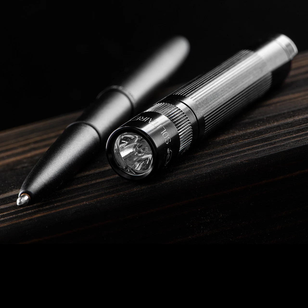 The Fisher Space Pen Bullet and Maglite Solitaire are supplied together in a presentation case. The black Maglite Solitaire incandescent is tiny, around 8cm in length, and weighing in at only 30g with the supplied AAA battery included.