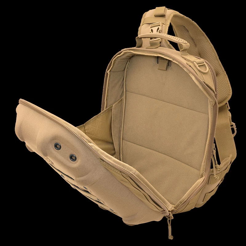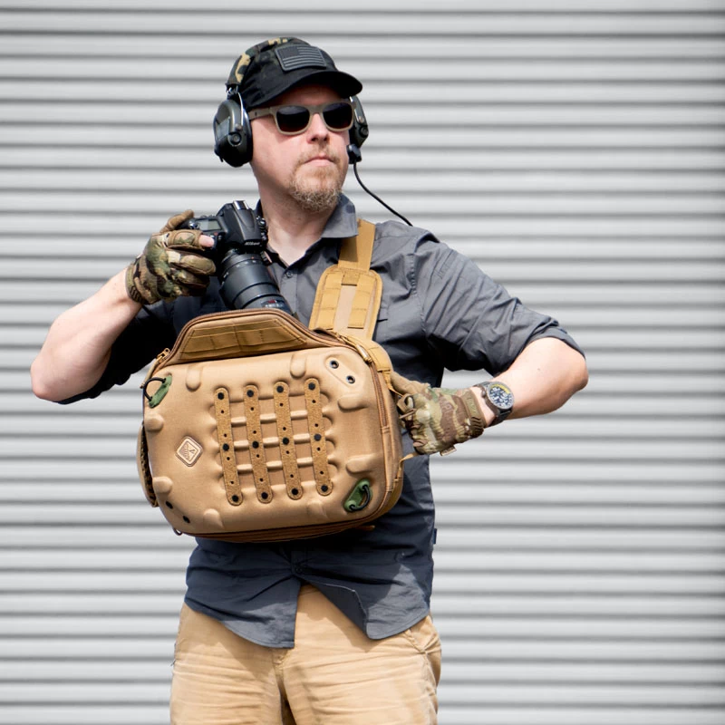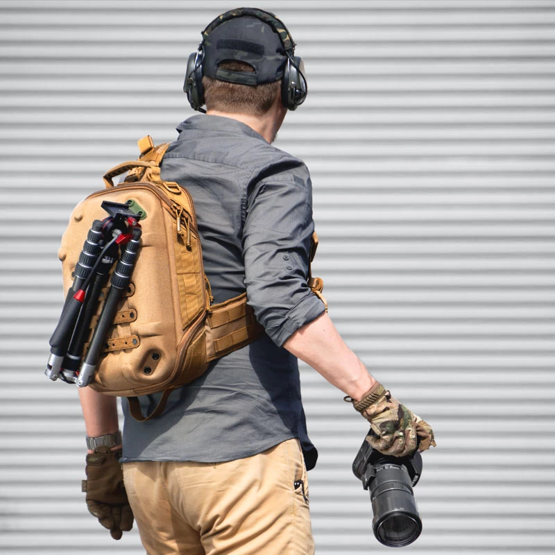 Military modular webbing (MOLLE) is provided on the sides, strap, and hip pad. The lid features the patented hard-molly system which is unique in the industry, allowing mounting of webbing accessories to a solid object. The polymer molle strips are covered in velcro for adding large i.d. patches, reflectors, etc. The patented locking roto-buckle is standard, as is the patented photo-d-ring which allows mounting of ¼-20” screw equipment like cameras, mini tripods, etc. and having the main strap serve as a solid retaining strap. ¼-20” screw ports are also provided on the hard-molle polymer strips. See the details below for the rest of the feature set.
