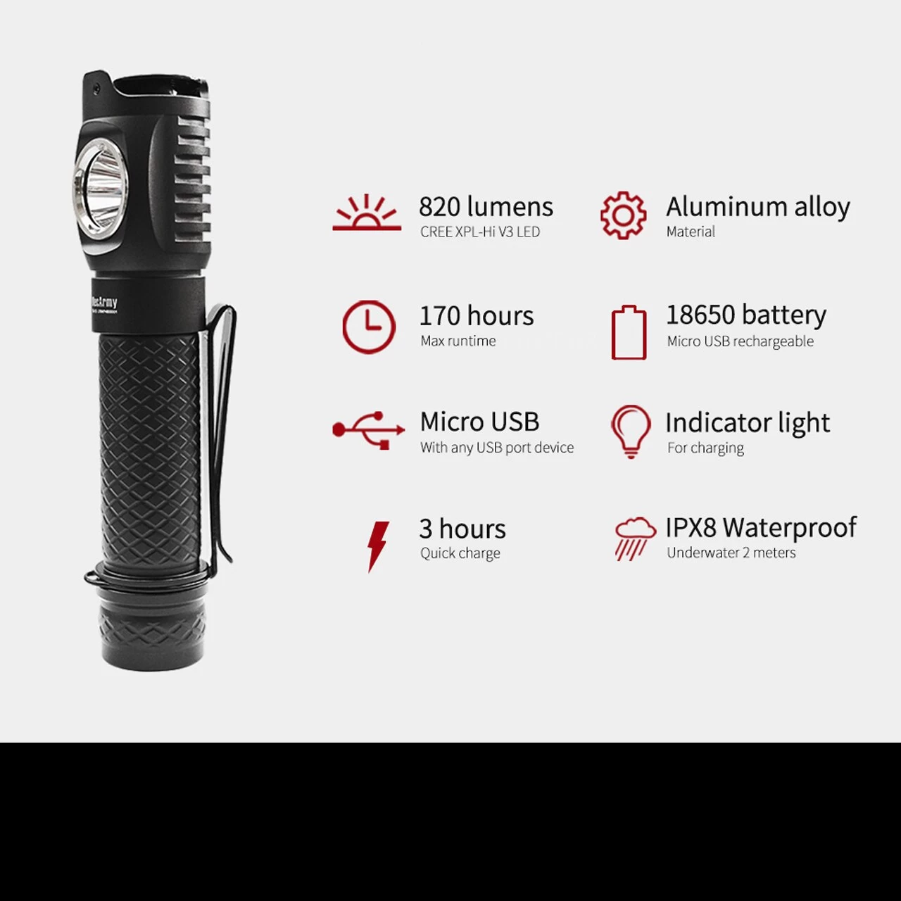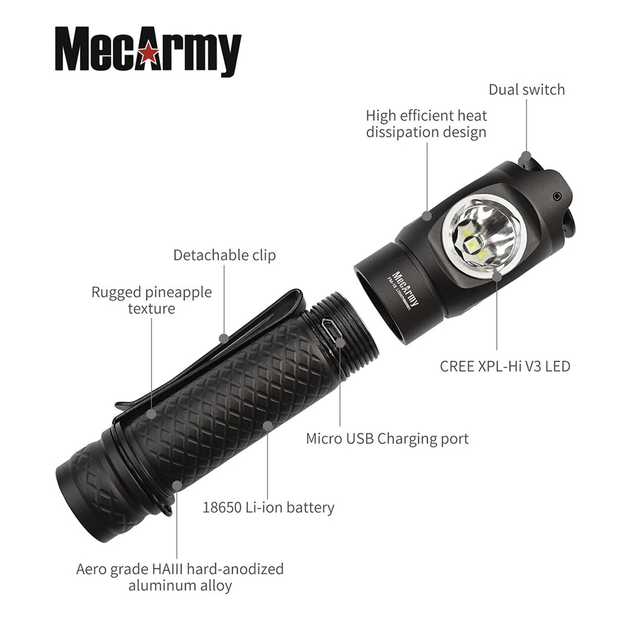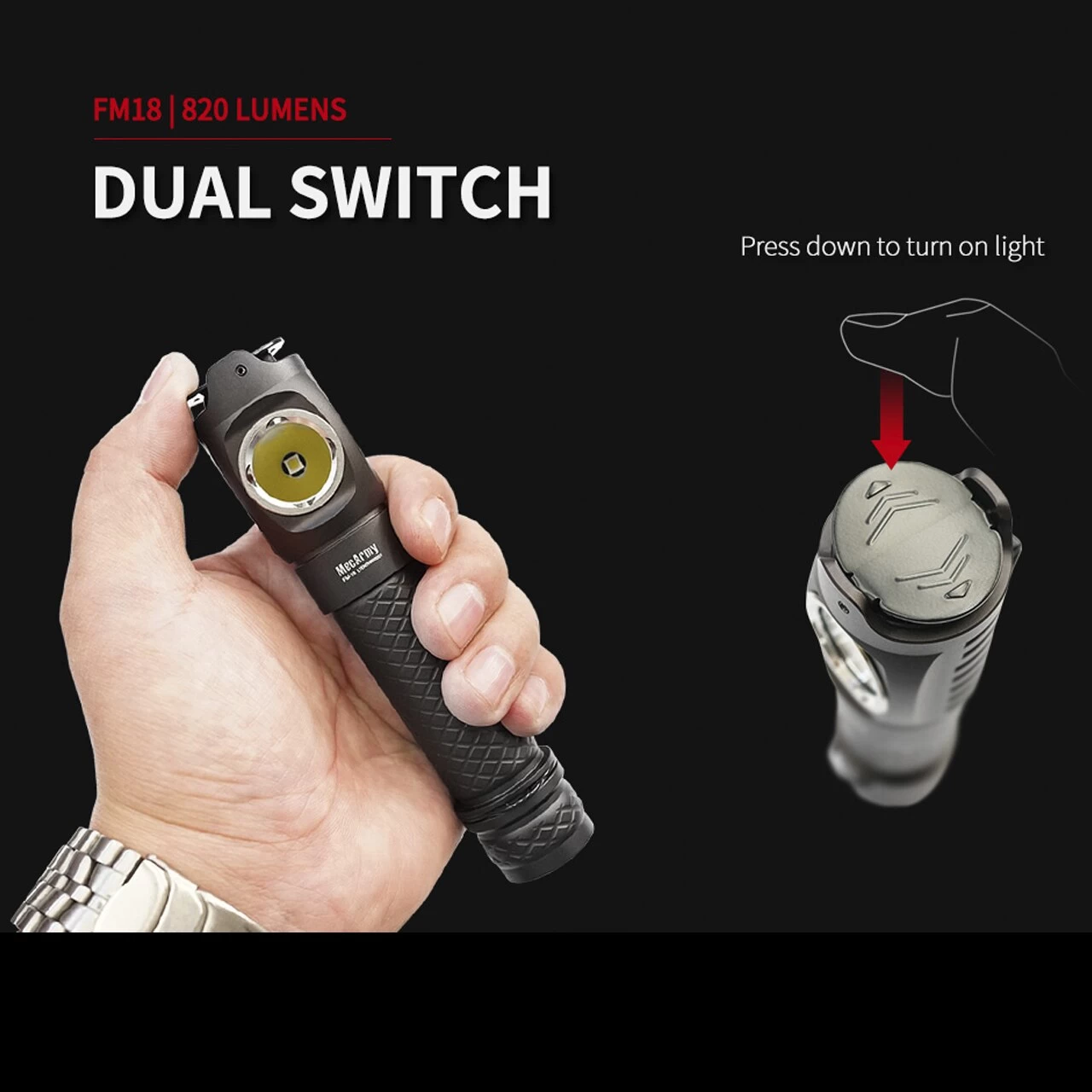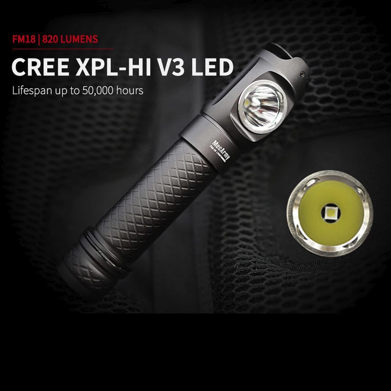 The Mecarmy FM series lights are equipped with CREE XPL-HI LEDs delivering high lumen levels and constructed from aero grade HAIII aluminium alloy. The MecArmy FM18 blasts out 820 lumens in a standing out the front design. It features a pocket clip and magnetic tail cap making carry and work easier and more convenient. Charging is easy on the go, thanks to the built-in standard Micro USB charging port with only a cable on any USB power devices. FM18 is powered by 18650 Li-ion battery.