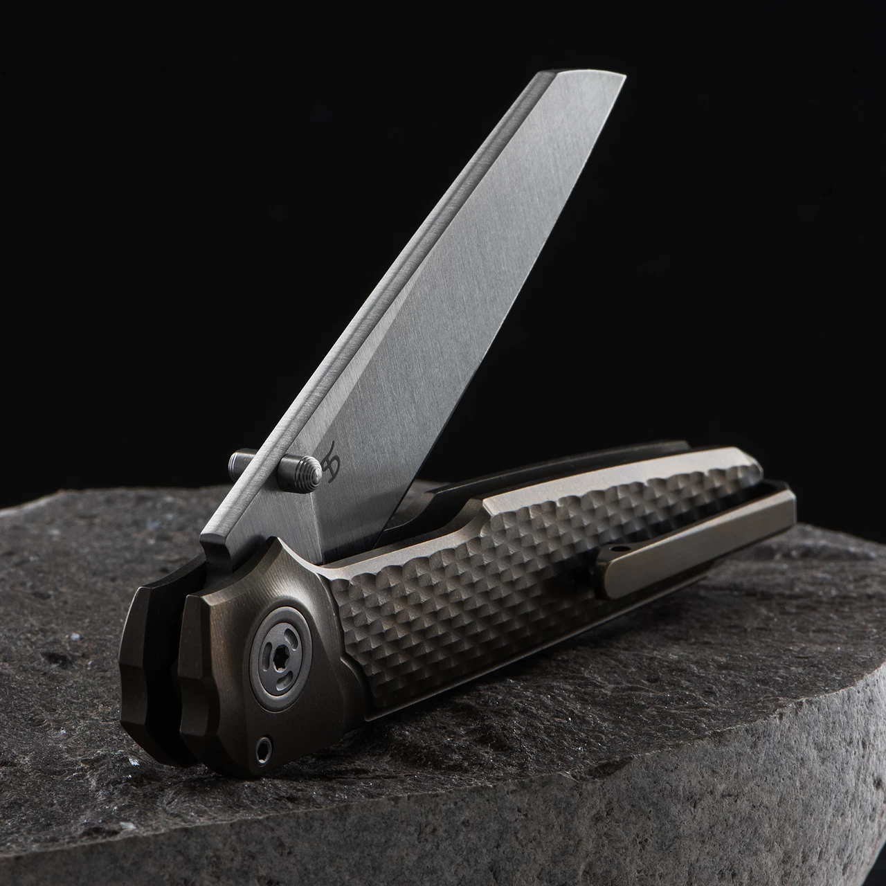 The MKM Miura is the 2022 Blade Show Imported Knife of the Year award and for good reason. Ground breaking design and efficient use of materials made it a stand out folder that deserves all the attention it gets. It occupies a unique position in the knife making industry thanks to its use of a button lock in combination with an integral handle. One piece of titanium, in a choice of plain, blue or bronze anodisation, is crafted into a handle with a button lock and pivot cut into the material. A pocket clip is also attached.