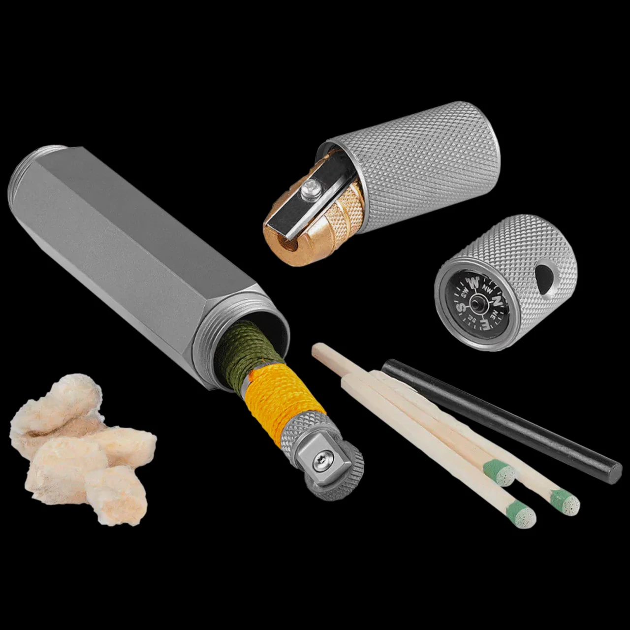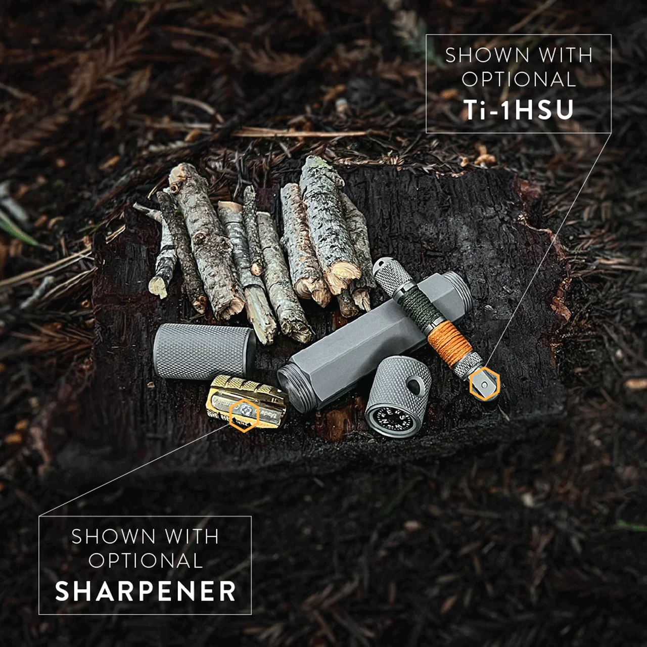 The Prometheus Ti-FST is a precision made titanium billet stash tube designed to store fire making supplies to create a small, yet fully self contained, survival fire making kit. The primary compartment is sized to fit the standard strike-anywhere match and/or the Prometheus Ti-1HSU Spark tool. The secondary compartment is sized to perfectly fit the German, barrel style pencil sharpener. This sharpener can create tinder shavings from suitably sized wood sticks, easily found in the wild. Or use this compartment to store pre-made tinder.