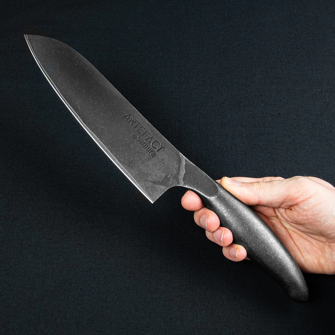 The Samura Artefact Series is an excellent choice for lovers of bold design and cooking enthusiasts who value style and performance in one package. The Santoku knife features an all metal construction with a distinctive stonewash finish. The blade is AUS-10 Damascus steel whilst the hollow handle is stainless steel providing excellent balance and lightness of touch in use.